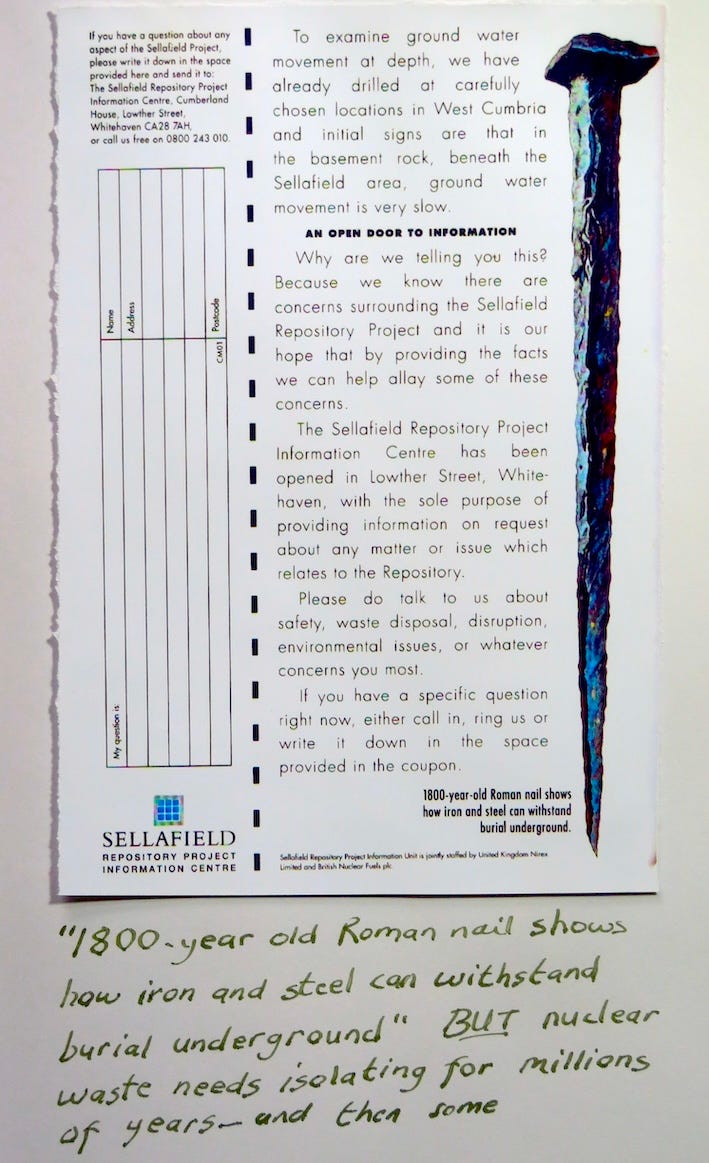 The Sellafield Repository Project Information Centre said in 1993 : ”1800 year old Roman nail shows how iron and steel can withstand burial underground”. BUT nuclear waste (and this plan was ‘just’ for low and intermediate level nuclear waste) needs isolating for millions of years —— and then some.