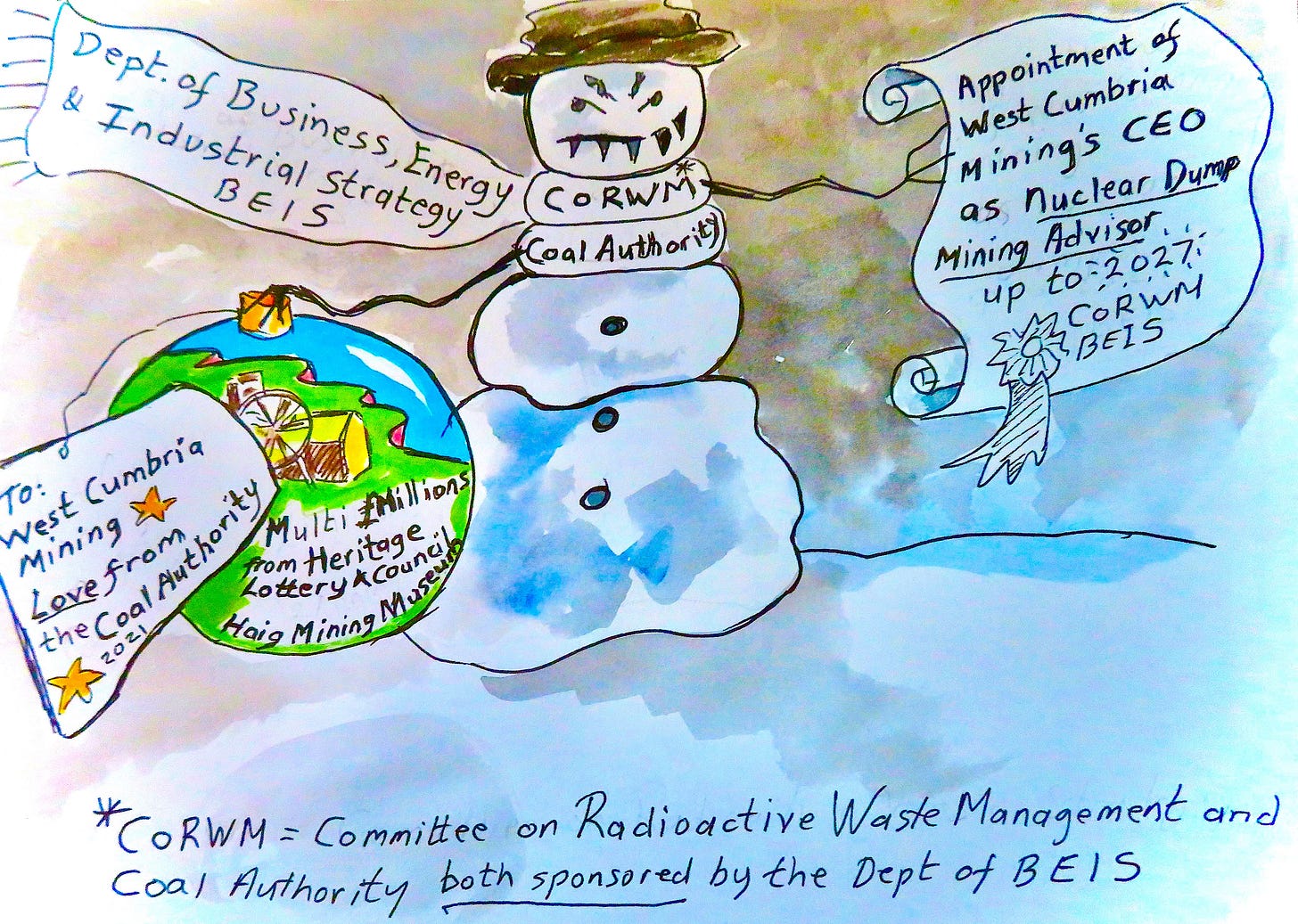 The same person advising government on controversial high level nuclear waste dumping in a mine many times the size of the proposed coal mine is benefitting financially from his government employers in BEIS (who sponsor the Coal Authority) handing over the multi million Haig Museum and land for the sum of £1. These conflicts of interests continue with close relationships between the former Coal Authority Director Stephen Dingle appointing Sir Nigel Thrift to Chair of the Committee of Radioactive Waste Management who appointed coal boss Mark KIrkbride Sir Nigel Thrift described the West Cumbria Mining CEO as an “invaluable” colleague in the deep nuclear dump plan. The next stage of the nuclear dump for VERY hot nuclear wastes is VERY deep boreholes.