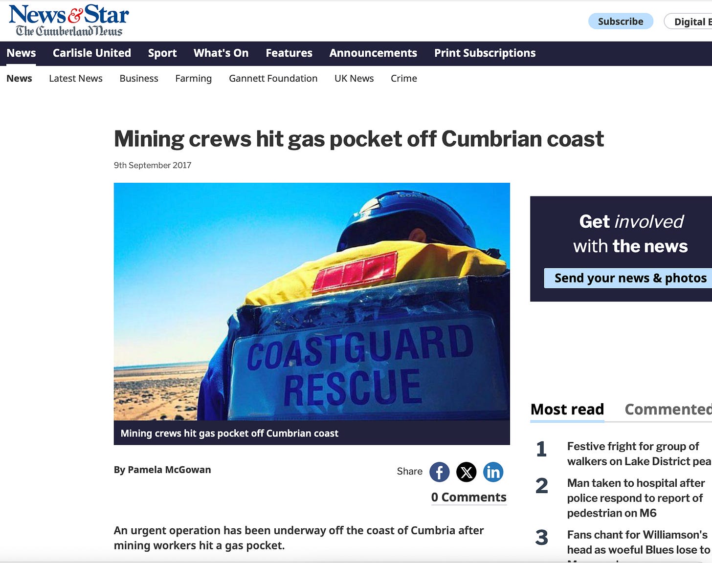 West Cumbria Mining Boreholes hitting methane at St Bees https://www.newsandstar.co.uk/news/16750209.mining-crews-hit-gas-pocket-off-cumbrian-coast/