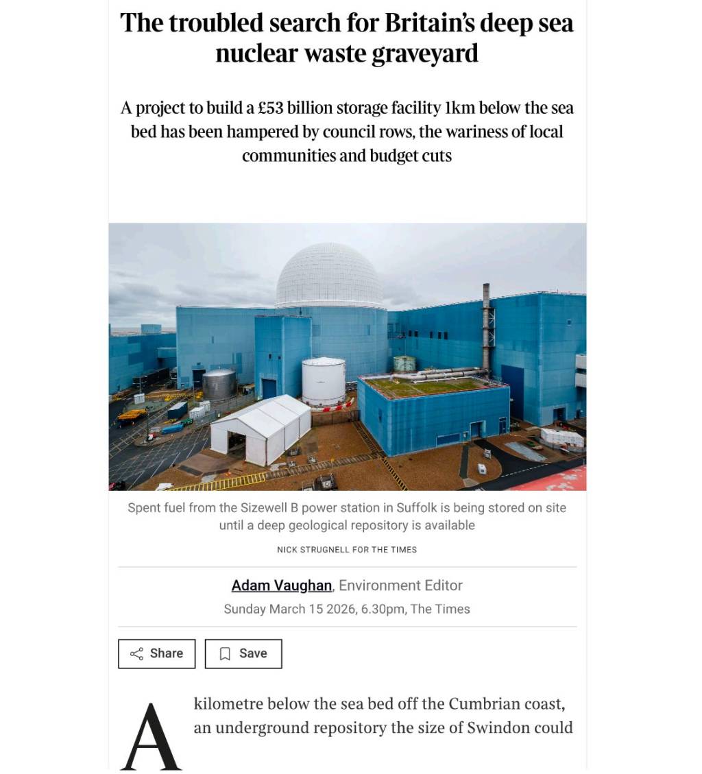 Governments have been trying to get shot of nuclear waste for decades (The troubled search for Britain’s deep sea nuclear graveyard: Adam Vaughan 16.03.26).